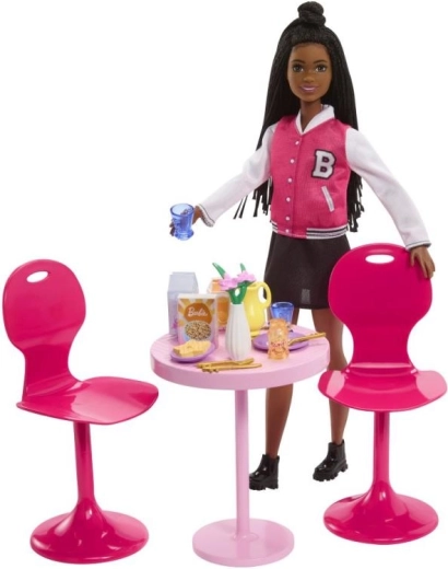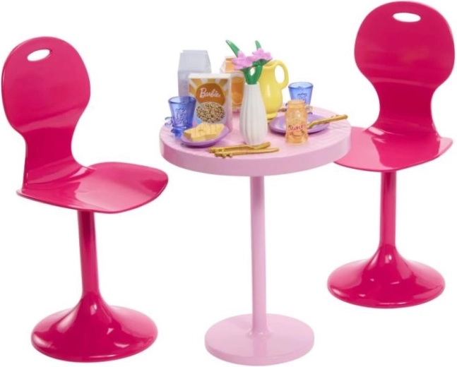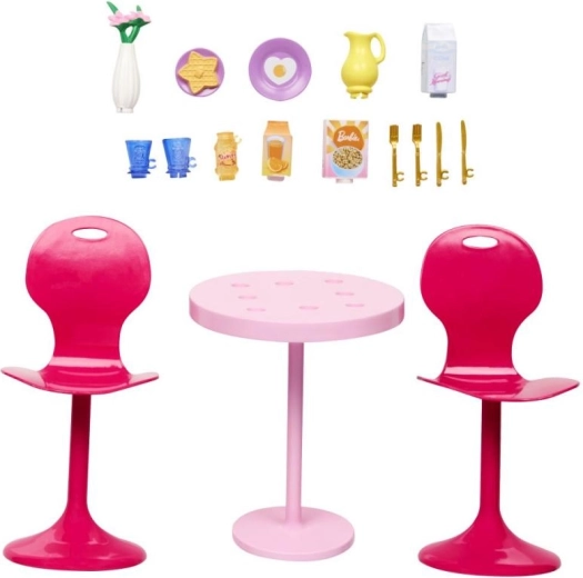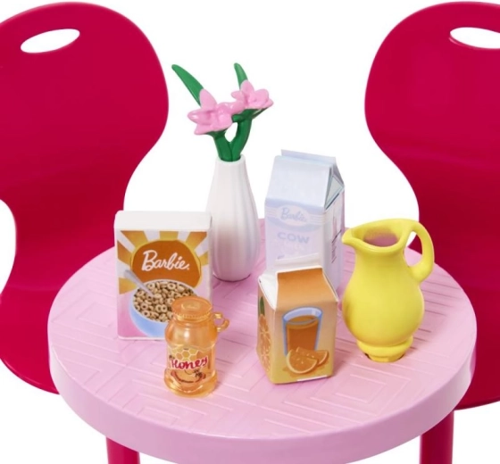 Okrúhly stôl, dve stoličky a mini doplnky ako riad, kvety a krabičky cereálií BARBIE – ideálne na raňajky, brunch aj popoludňajší čaj.