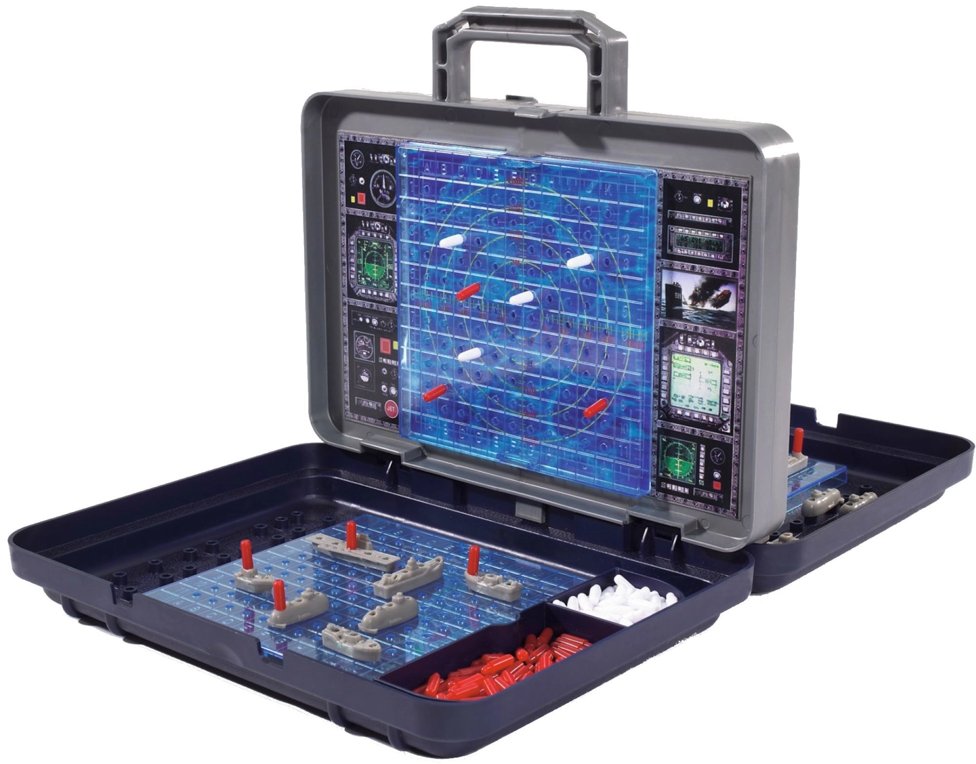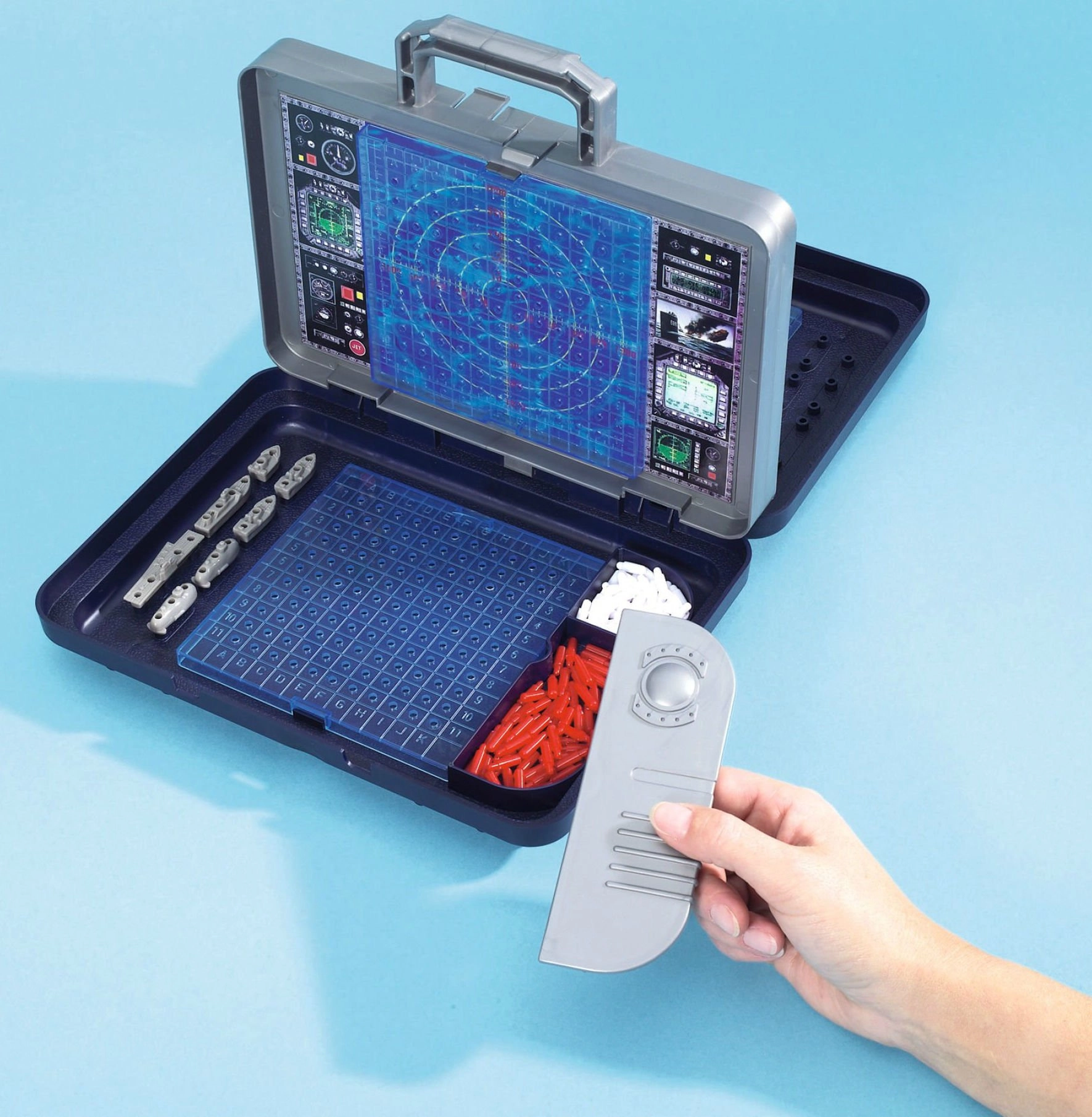 Srdcom sady je odnímateľná vertikálna stena pripomínajúca radar, ktorá oddeľuje obe hracie plochy. Zaznamenáte na ňu zásahy aj minutia a zároveň zaistíte, že si hráči neuvidia do rozmiestnenia lodí. Integrované priehradky v kufríku udržia všetky dieliky pekne pokope.