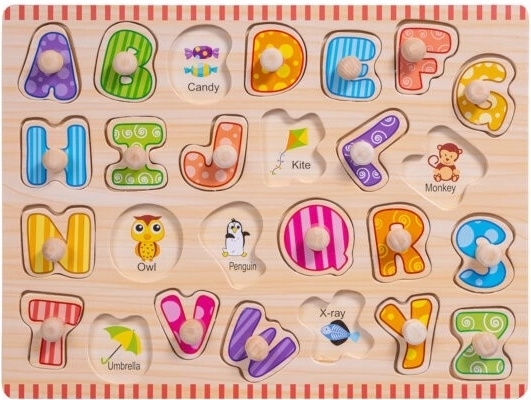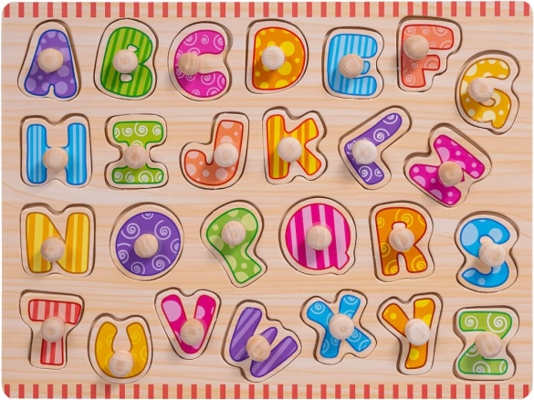 Drevené puzzle Abeceda s úchytmi je skvelá výuková hračka, ktorá pomáha deťom spoznávať tvary a poradie písmen abecedy. Doska obsahuje výrezy v podobe písmen, do ktorých deti umiestňujú zodpovedajúce farebné kúsky. Každý kus má malý úchyt pre ľahkú manipuláciu, čo posilňuje jemnú motoriku a koordináciu oko-ruka. Priraďovanie správnej litery k anglickému slovu a ilustrácii na doske navyše podporuje učenie cez vizuálnu asociáciu.
