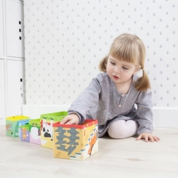 Ľahké, ale pevné kocky z papierového kartónu sa deťom dobre držia a sú bezpečné pre malé ručičky. Po hraní ich jednoducho vložíte jednu do druhej a prenesiete v praktickej krabici s uškom. Najväčšia kocka má stranu 13 cm, najmenšia 4 cm – ideálne veľkosti na postupné učenie a radosť z úspechu.
