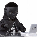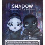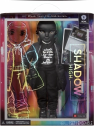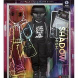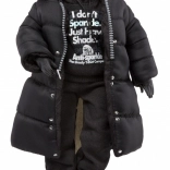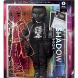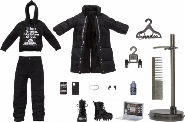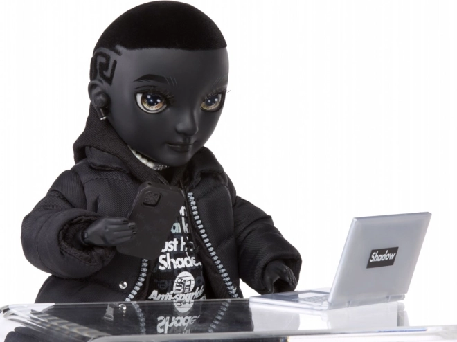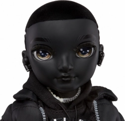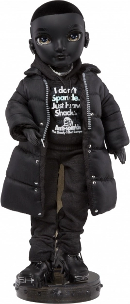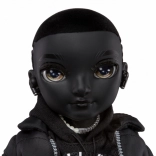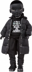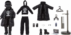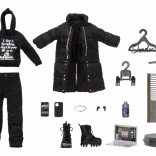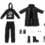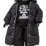 Bábika je oblečená do štýlového čierneho outfitu s moderným a mestským vzhľadom, vrátane dlhého čierneho kabáta a doplnkov.