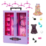 Objavte svet módy s Barbie Prenosná Skriňa na Oblečenie. Táto skriňa v charakteristických farbách Barbie - ružová a fialová - ponúka veľa úložných riešení s viacerými policami a šiestimi mini vešiakmi.