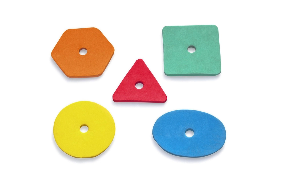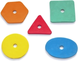Oblúk so špeciálnymi otvormi a 5 farebnými penovými tvarmi učí deti rozpoznávať farby a tvary a zlepšuje jemnú motoriku aj koordináciu.
