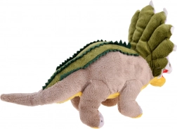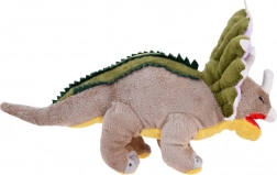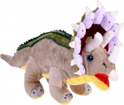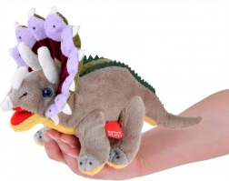 Tento plyšový dinosaurus predstavuje vernú repliku Triceratopsa s charakteristickými rohmi a výraznými modrými očami.