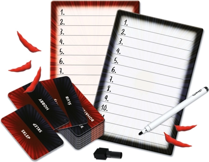 - 168 kariet s kategóriami, 9 papričiek, 2 stierateľné tabuľky, 2 fixky, presýpacie hodiny, pravidlá