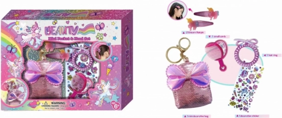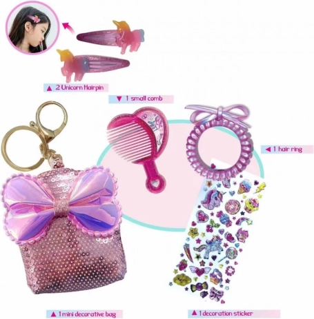 Roztomilá dievčenská sada na vlasy s motívom jednorožca poteší každú malú parádnicu. Obsahuje dekoratívnu taštičku s flitrami a mašličkou, ktorá môže slúžiť aj ako prívesok, ďalej 2 sponky s jednorožcom, hrebeň, špirálovú gumičku a hárček samolepiek. Ideálna ako darček.