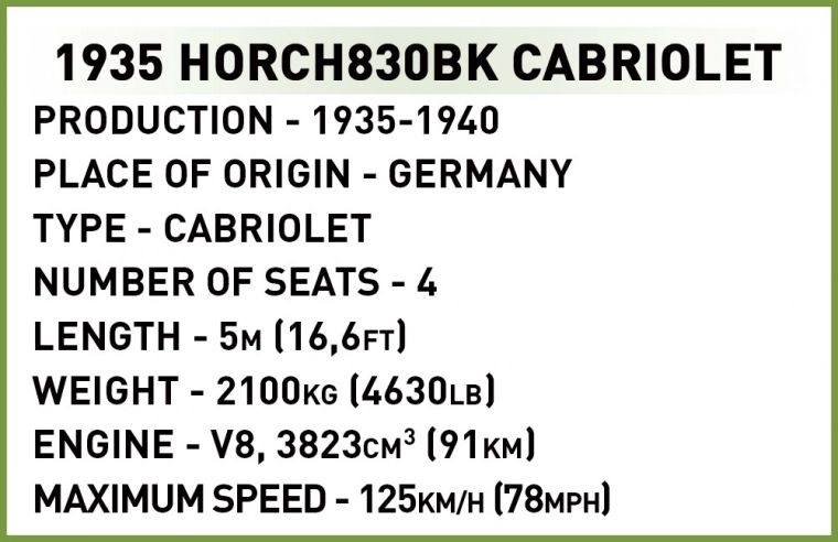Táto realistická stavebnica zachytáva skrátenú verziu legendárneho vozidla HORCH 830BK, známeho svojou kvalitou a technickými inováciami. Špeciálne navrhnuté prvky pre modely vozidiel zabezpečujú verné proporcie a množstvo prekvapivých detailov. Trvalé potlače namiesto nálepiek dodávajú modelu špičkový vzhľad a odolnosť pri hraní.