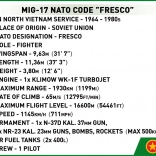 Táto realistická stavebnica prináša slávny stíhač MIG‑17 (v Poľsku vyrábaný ako LIM‑5), ktorý slúžil vo vzdušných silách viac než 40 krajín. Atraktívna kamufláž inšpirovaná exponátom z múzea na lietadlovej lodi USS Intrepid skvele vynikne v každej zbierke letectva, Cold War či Vietnam War.