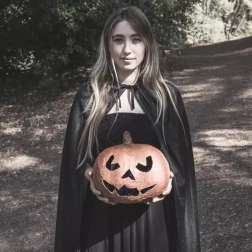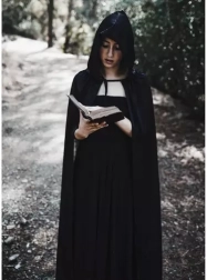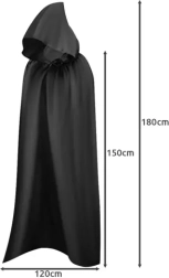 Táto dlhá čierna pláštenka s kapucňou je ideálny doplnok ku kostýmom čarodeja, čarodejnice, upíra alebo mysterióznych postáv. Vďaka jednoduchému viazaniu na šnúrky ju ľahko oblečiete cez bežné oblečenie a voľný strih neobmedzuje v pohybe – perfektné na tanec aj fotenie.