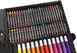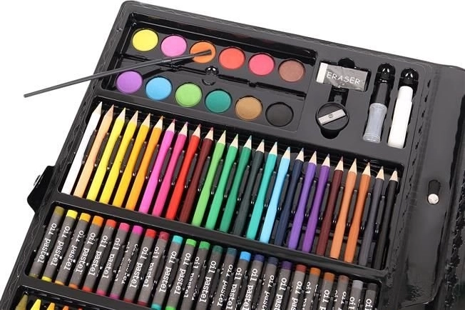 Súprava obsahuje širokú škálu umeleckých potrieb, od pasteliek po akvarelové farby, čo ju robí ideálnou pre rozličné tvorivé projekty.