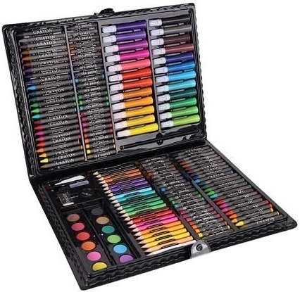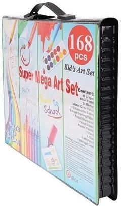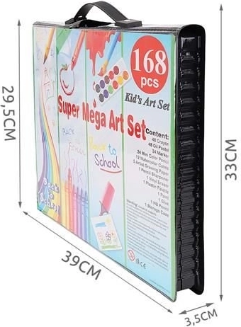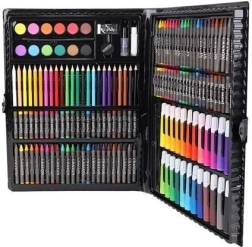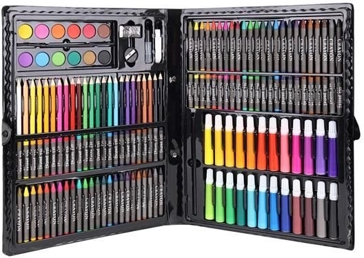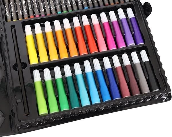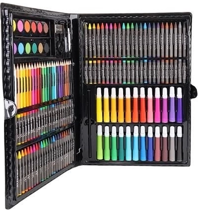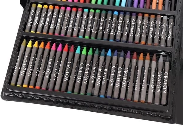 Super Mega Súprava Umeleckých Potrieb 168 Ks ponúka všetko, čo potrebujete pre tvorbu umeleckých diel: 24 pastelových pasteliek, 24 farebných fixiek, 48 olejových pasteliek, 48 voskových pastelov, 12 akvarelových farieb a mnoho ďalšieho. Všetky potreby sú elegantne usporiadané v praktickom puzdre, čo zabezpečuje jednoduchý prístup a prehľadnosť.