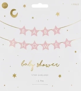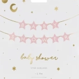 Dodajte svojej baby shower výzdobe pôvab pomocou papierového banera s hviezdičkami a nápisom Baby Shower. Svetloružové prevedenie je ideálne pre nežné, elegantné a fotogenické dekorácie.