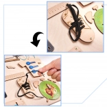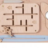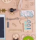 Drevená manipulačná tabula ponúka deťom zábavu a rozvoj vďaka širokej škále interaktívnych prvkov. Hra na tejto tabuli pomáha rozvíjať jemnú motoriku, koordináciu očí a rúk a učí ich premýšľať príčinne-následne. Výrobok zaisťuje bezpečnosť vďaka hladko brúsenému drevu.