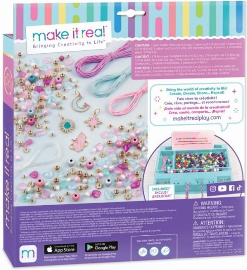 Objavte kreatívnu sadu Make It Real Celestial Stones na výrobu až ôsmich jedinečných náramkov. V balení nájdete všetko potrebné – od korálikov a perličiek po prívesky a šnúrky. Perfektná voľba na rozvoj detskej fantázie, jemnej motoriky a sebavyjadrenia. Sada je bezpečná, testovaná podľa najvyšších štandardov a prináša veľa zábavy pri tvorení.
