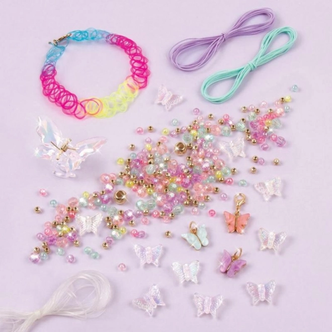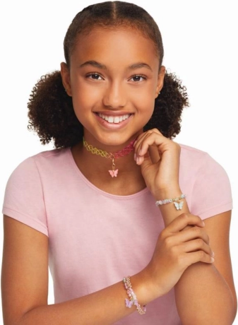 Vytvorte vlastnú kolekciu módnych doplnkov s touto úžasnou sadou na výrobu šperkov! Obsahuje všetko potrebné k výrobe *troch náramkov* a *dvoch náhrdelníkov* , vrátane trendového *elastického chokera* .