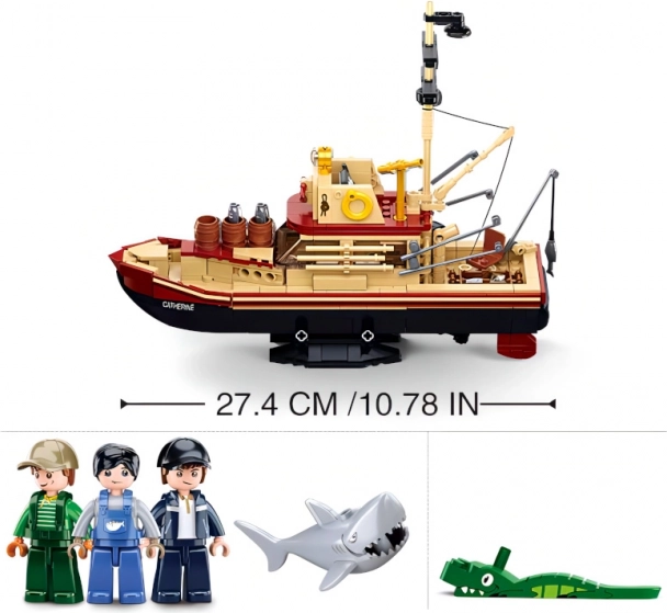 Stavebnica rybárskej lode Catherine prináša radosť z modelovania a je ideálna pre deti aj dospelých, ktorí milujú výzvy. Zložená loď meria cez 27 cm a je doplnená realistickým žralokom. Stavebnica obsahuje tri inovatívne figúrky s otočnými a výkyvnými časťami tiel, čo zabezpečuje väčšiu flexibilitu pri hraní.