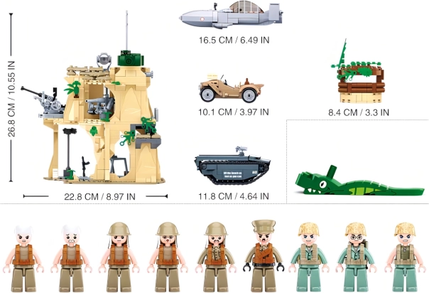 Postavte si vlastnú vojenskú základňu a znovu prežite legendárny konflikt s 1027 dielikmi a 9 figúrkami. Táto detailná stavebnica SLUBAN ponúka pevnosť s úkrytmi, vojenský džíp, stíhacie lietadlo, pásové vozidlo a motorku. Dieliky z odolného ABS plastu sú kompatibilné s LEGO, COBI a MEGA BLOKS a potešia kvalitným spracovaním aj skvelou hrateľnosťou.