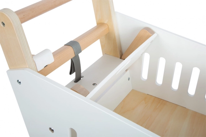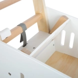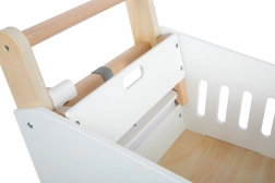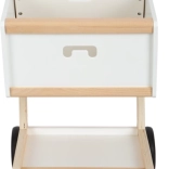 Tento detský nákupný vozík je vyrobený z pevného dreva a je vybavený pogumovanými kolieskami pre tichý a hladký pohyb. Rovnako ako v skutočnom supermarkete, tu je možnosť využitia magnetického čipu v držiaku. Vozík ponúka priestranný košík pre rôzne predmety a ďalší úložný priestor na spodnej časti.