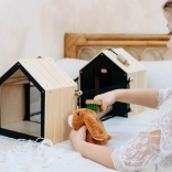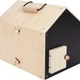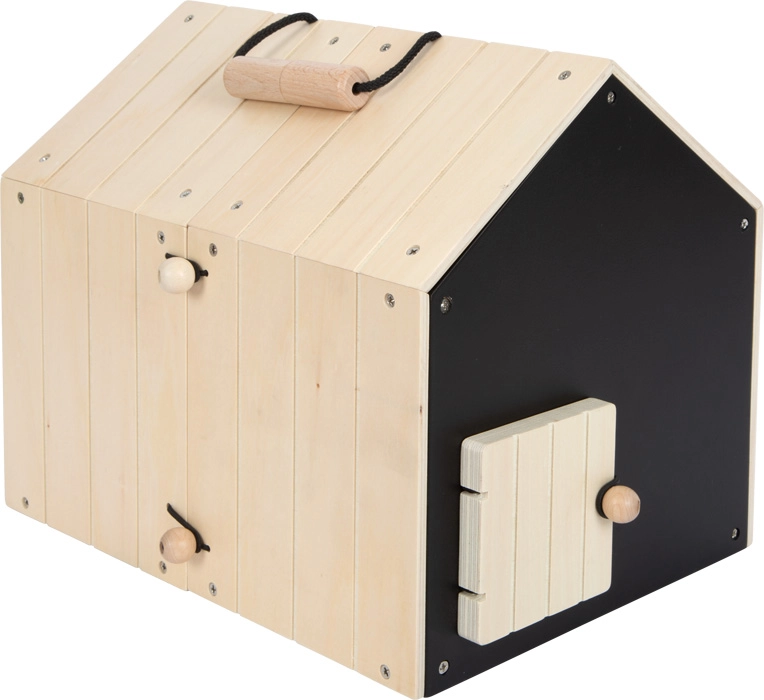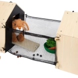 Táto premyslená králikáreň z kvalitného dreva ponúka dve oddelené búdky – jednu na pokojné spanie a druhú s sieťovaným okienkom na pozorovanie okolia. K búdkam ľahko pripojíte pletivové ploty a vytvoríte tak vonkajší výbeh pre ešte zábavnejšie hranie. Zadnú čiernu stenu možno popisovať kriedou, čo prináša ďalšiu porciu tvorivej interakcie.
