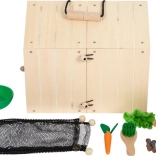 Plyšový králik, drevená králikáreň (2 búdky), 2 pletivové ploty, metlička, miska, drevená mrkva, kúsok šalátu, plstené bobky