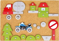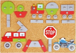 Táto zábavná a vzdelávacia zatliekacia hra je ideálna pre malých tvorcov. Deti si môžu navrhovať vlastné dopravné prostriedky a pribíjať ich na korkovú dosku pomocou kladivka a klincov. Farebné aj potlačené dieliky ponúkajú nespočetné kombinácie a podporujú predstavivosť.