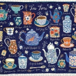 - Motív plný čajových pokladov: kanvice, podšálky a lyžičky v elegantnom aranžmáne.