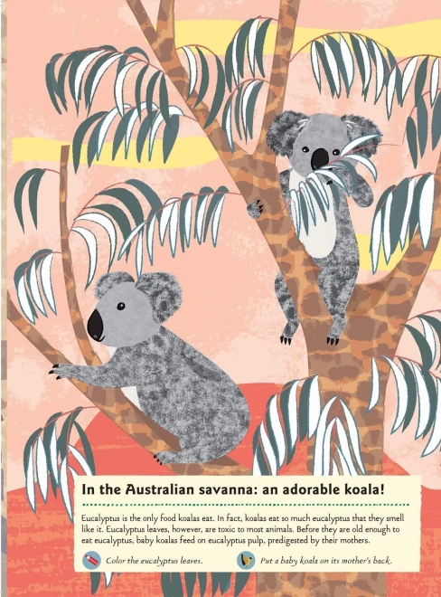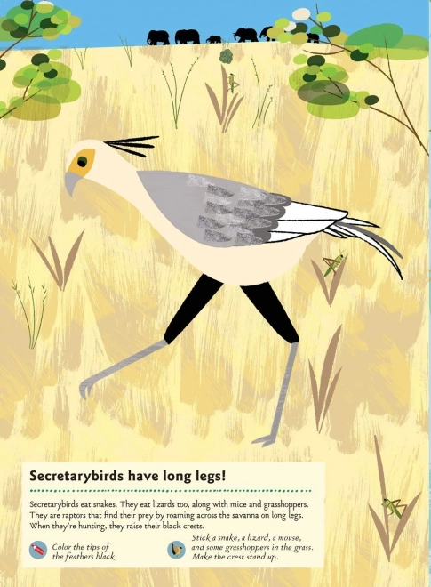 Táto kreatívna kniha aktivít deti prevedie fascinujúcim svetom saván Afriky, Austrálie aj Brazílie. Vďaka samolepkám a úlohám si malí objavitelia zapamätajú zaujímavé fakty a precvičia jemnú motoriku aj sústredenie. Nechajte deti umiestniť rohy impaly, schovať levíčatá do vysokej trávy alebo nalepiť ovocie na strom pre slony.