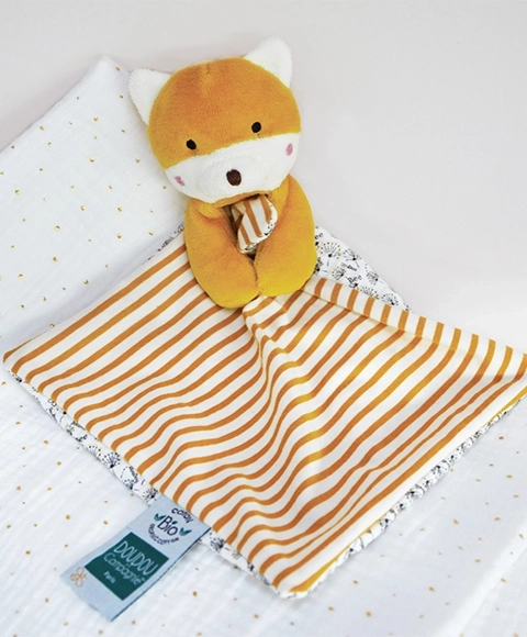 Táto hebká líška s muchláčikom bola navrhnutá v harmonických, prírodou inšpirovaných farbách, aby bábätku priniesla pocit pokoja a bezpečia. Organické materiály šetrné k pokožke podporujú rozvoj zmyslov, zatiaľ čo jemná textúra upokojuje a sprevádza dieťatko pri spánku aj odpočinku.