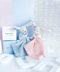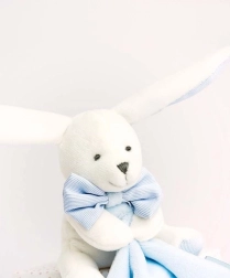 Táto darčeková sada obsahuje bieleho zajačika s hebkým maznáčikom v modrej farbe, uložené v krásnej krabičke pripravenej na obdarovanie. Mäkučký materiál poskytuje bábätku pocit bezpečia a pohodlia, zatiaľ čo ľahká dečka sa skvelo drží v malých ručičkách.