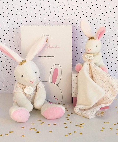 Táto darčeková sada DOUDOU prináša bieleho plyšového zajačika s bodkovaným muchláčikom v kompaktnej veľkosti 10 cm, s ktorým sa deťom skvelo manipuluje už od prvých týždňov života. Hebký materiál a jemné farby podporujú upokojenie a zmyslové vnímanie bábätka.
