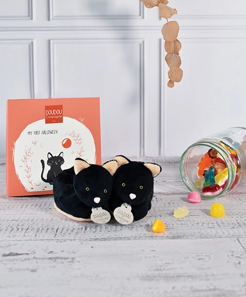 Hľadáte originálny a praktický darček pre novorodenca? Plyšové topánočky DOUDOU s motívom čiernej mačky sú jemné k citlivej detskej pokožke a spoľahlivo zahrejú. Vďaka hravému dizajnu dodajú detskému outfitu šmrnc – či už na halloweensku párty, alebo pri každodenných prechádzkach.