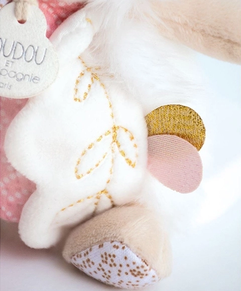 Elegantné pastelové prevedenie a kvalitné spracovanie spĺňajú európske normy CE. Hračka sa ľahko udržiava – stačí ju vyprať na 30 °C a nechať prirodzene alebo pri nízkej teplote vysušiť. Skvelý tip na darček k narodeniu bábätka aj na Vianoce.