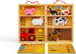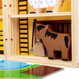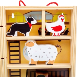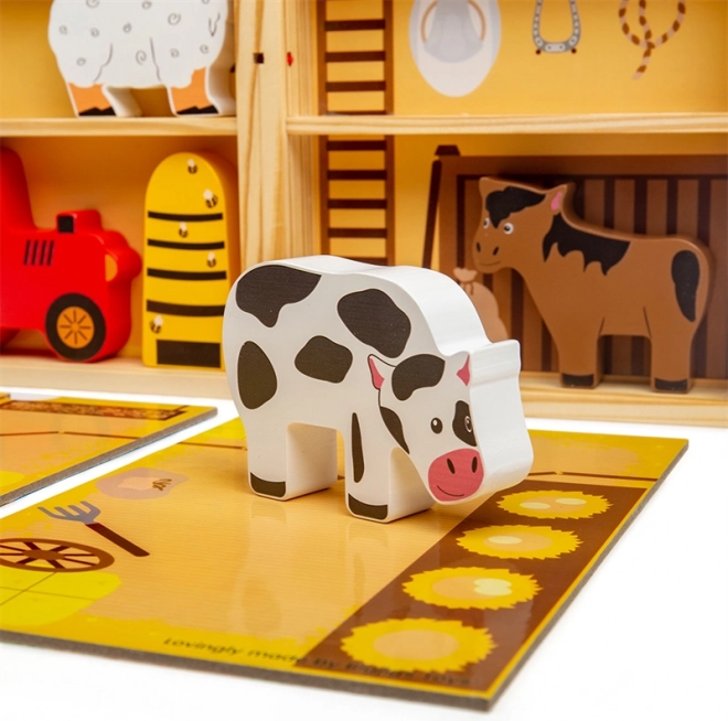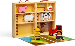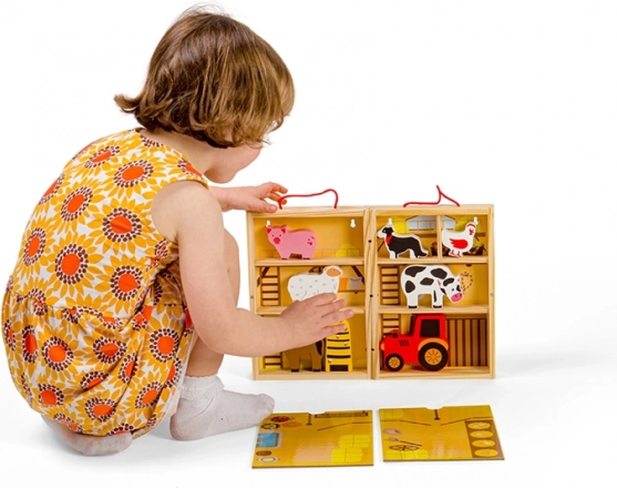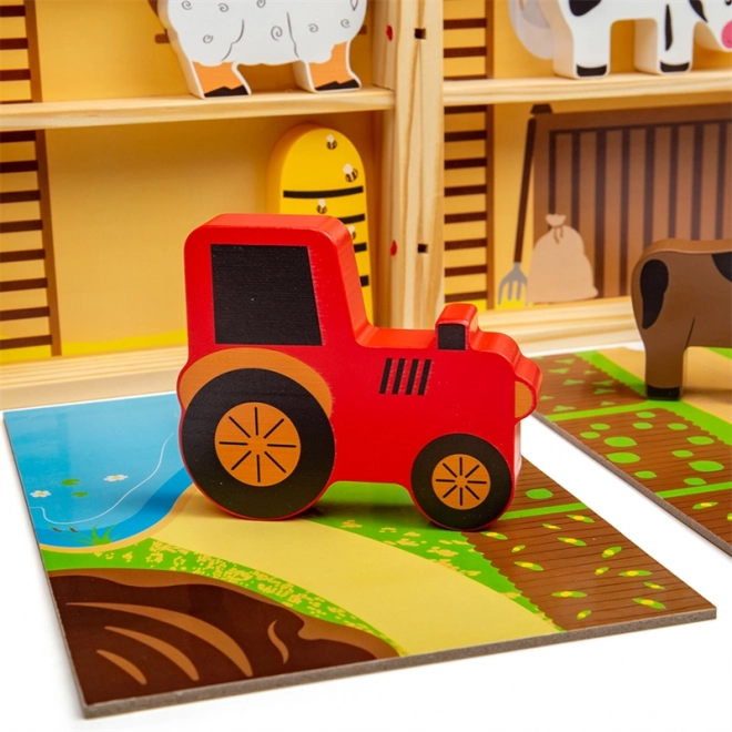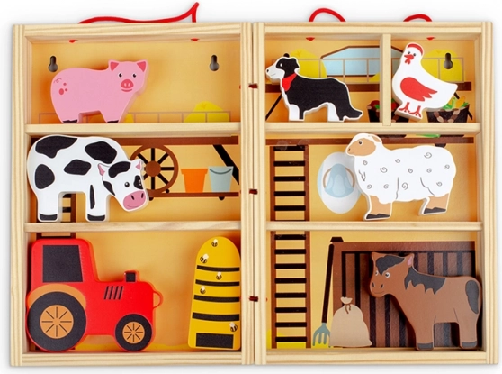 Súčasťou sú zvieratká (kôň, krava, pes, prasa, ovca), včelí úľ a traktor. Výrazné farby a bezpečné spracovanie z masívneho dreva.