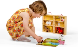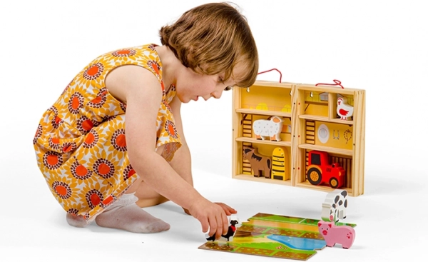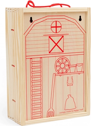 Táto štýlová drevená farma sa behom chvíľky rozloží na kompletnú hernú scénu a po hre sa zase všetko jednoducho uloží späť do krabičky. Je ideálna na cesty – kompaktná, odolná a pripravená na hru kedykoľvek a kdekoľvek. Kvalitné masívne drevo a hladké hrany zabezpečujú bezpečné hranie pre najmenších.