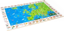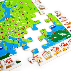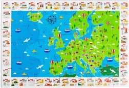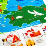 Farebná mapa Európy s vlajkami a ikonickými pamiatkami motivuje deti objavovať štáty a ich polohu. Skladanie rozvíja logiku, orientáciu aj slovnú zásobu.