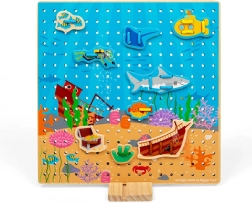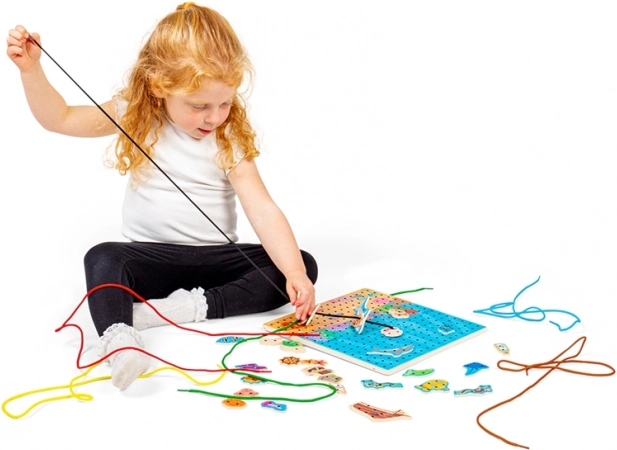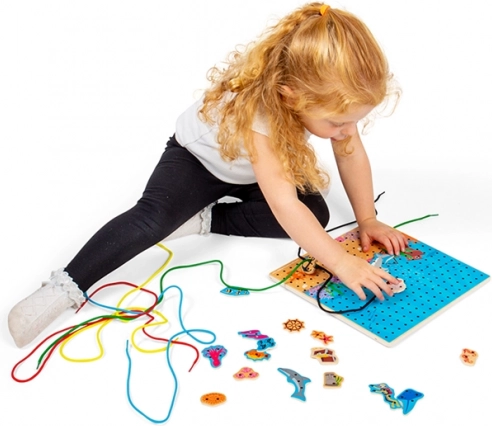Prešívacia doska s podmorským motívom je ideálna vzdelávacia hračka pre deti od 3 rokov. Drevená perforovaná doska, farebné šnúrky a sada morských dielikov umožňujú deťom precvičiť pršteky, fantáziu aj sústredenie. Hra je intuitívna a vďaka pevnej konštrukcii z kvalitného dreva skvele odoláva každodennému hraniu.