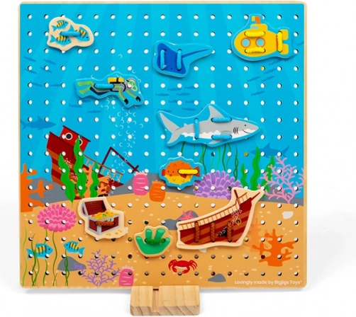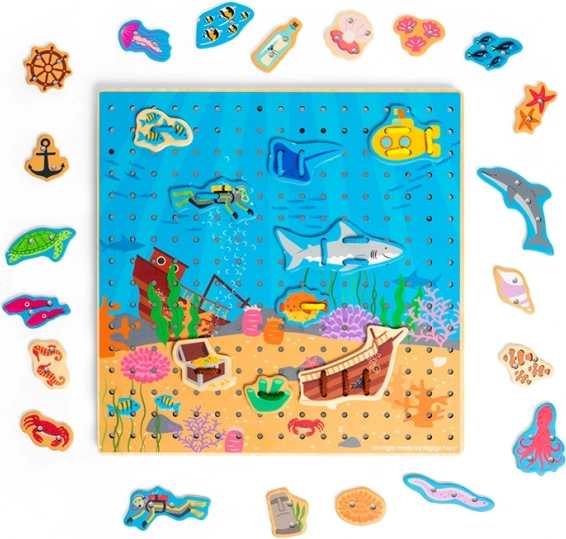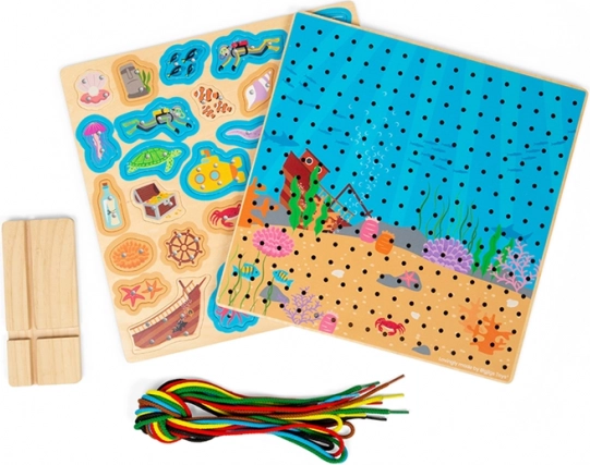 Set obsahuje 30 dielikov a 6 farebných šnúrok, s ktorými možno vytvárať nespočet scén – od rybičiek a potápača po ponorku a potopenú loď. Materiály sú šetrne získané a hračka spĺňa aktuálne európske bezpečnostné normy.