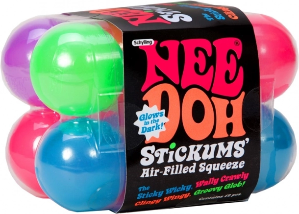 NeeDoh Stickums prináša kombináciu relaxácie a zábavy v praktickom balení. Guličky majú príjemne mäkký, lepiaci povrch, takže ich môžete nielen mačkať, ale aj prikladať a hádzať na hladké povrchy – steny, okná či stropy – a sledovať, ako sa pomaly uvoľnia a spadnú.