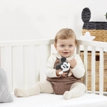 - Zmyslová stimulácia: jemné hrkanie, rôzne textúry a ľahké uchopenie posilňujú koordináciu ruka–oko.
