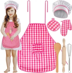 - Kompletná súprava: Zahŕňa 7 prvkov, ako sú zásterka, kuchárska čiapka, ochranná rukavica, podložka pod horúce nádoby, drevený valček, lyžica a kovová metla.