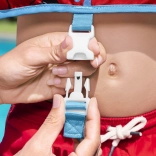 Nastaviteľné popruhy a robustná plastová pracka držia vestu pevne na mieste, zároveň poskytujú voľnosť pohybu a jednoduché obliekanie aj vyzliekanie.