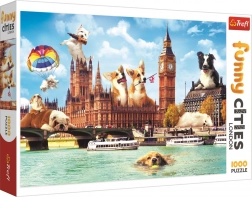 Puzzle obsahujú koláž obrázkov psov rôznych plemien v prostredí vysoko rozpoznateľného Londýna.