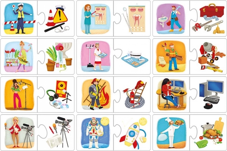 Súprava obsahuje 24 skladačiek, z ktorých možno zostaviť 12 obrázkov predstavujúcich povolania a vlastnosti.