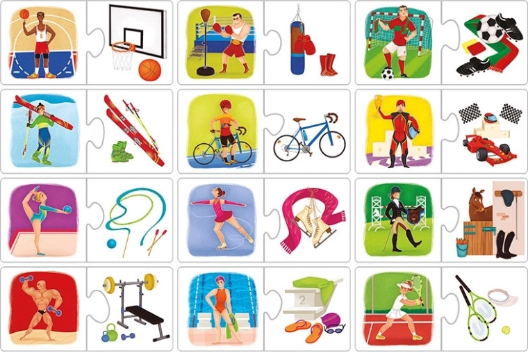 Vzdelávacie puzzle Šport a atribúty zábavnou formou rozširuje povedomie detí o športových disciplínach. Každý pár prepája športovca s jeho typickým vybavením, čo posilňuje logické myslenie a schopnosť priraďovania. Odolné dieliky sú navrhnuté na časté používanie a ľahké uchopenie malými detskými rukami.