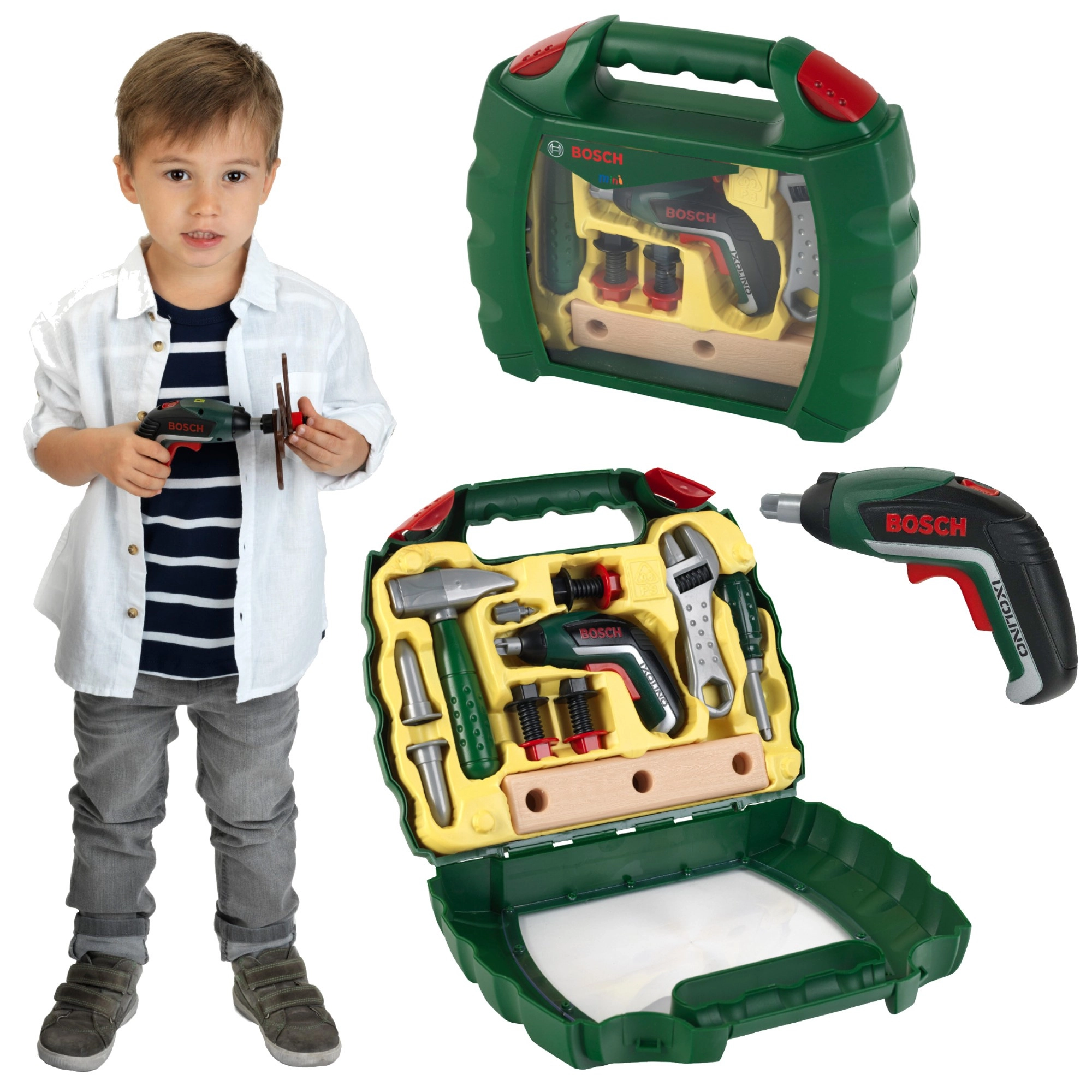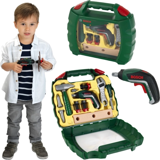 Praktický detský kufrík s náradím z licencovanej rady BOSCH Mini od značky Klein poteší každého malého majstra. Obsahuje funkčný hračkársky aku skrutkovač Ixolino II s vymeniteľnými bitmi, režimom pravý/ľavý chod a zvukom motora, doplnený o kladivo, skrutkovač, francúzsky kľúč, skrutky, matice a „drevené“ dieliky. Pevný tmavozelený kufrík s priehľadným čelom a dvojitým červeným zámkom udrží všetko bezpečne pokope.