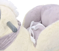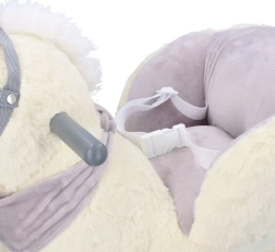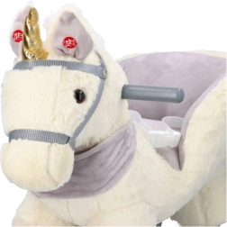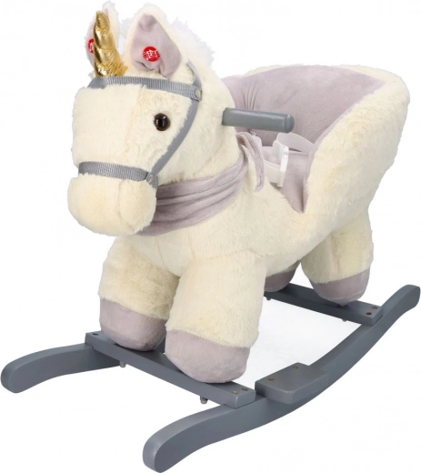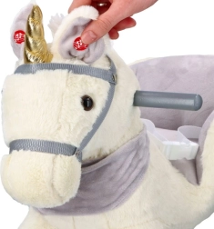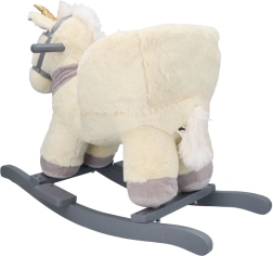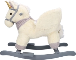 Tento plyšový hojdací jednorožec so zlatým rohom a jemnými sivými detailmi je ideálnou voľbou na domáce hranie. Mäkké sedadlo s opierkami a bezpečnostným pásom zaistí pohodlie aj stabilitu, zatiaľ čo drevené lyžiny a úchyty poskytujú istý a plynulý pohyb.