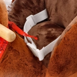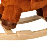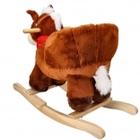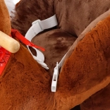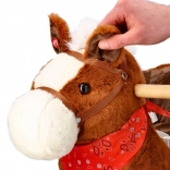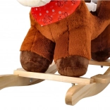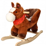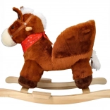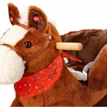 Hojdací koník je vybavený mäkkým hnedým telom, bielou hrivou a červenou šatkou, ktorá mu dodáva realistický a priateľský vzhľad.
