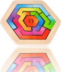Kreatívne mozaikové puzzle v kruhovom drevenom rámiku poteší malých aj väčších staviteľov. Zo 16 farebných dielikov poskladáte originálne vzory podľa predlohy aj fantázie. Podporuje jemnú motoriku, trpezlivosť a rozpoznávanie farieb, je vyrobené z dreva s farbami na vodnej báze a dá sa skladať v rámiku aj mimo neho.