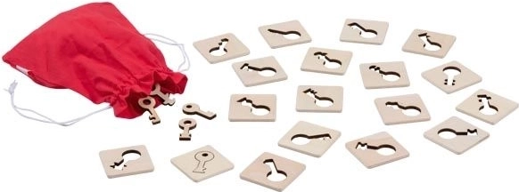 Hmatová hra pexeso Kľúče je originálna postrehová a zmyslová aktivita, ktorá podporuje sústredenie, koordináciu oko–ruka a rozlišovanie drobných rozdielov. Hráči vyťahujú z vrecúška kľúče a snažia sa čo najrýchlejšie nájsť zodpovedajúcu šablónu na drevenej doštičke – správna voľba znamená bod.