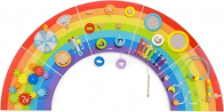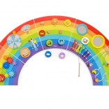 Ozubené kolieska, panel počasia, rotačný disk, vkladanie tvarov, xylofón, konkávne aj konvexné zrkadlo, gong a prevliekacie koráliky – všetko na jednom mieste pre zábavné učenie.